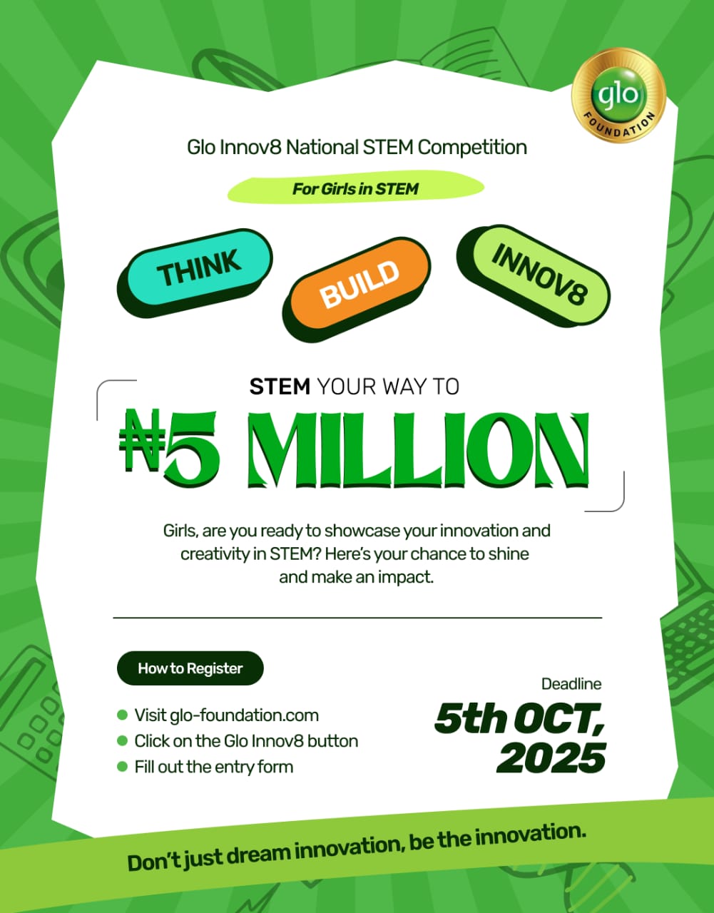 To register for a chance to win, all that schools across Nigeria have to do is visit https://glo-foundation.com/glo-innov8/ and fill the form, to STEM their way to N5,000,000.